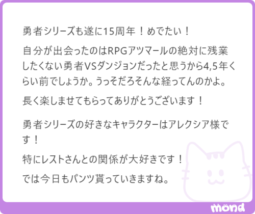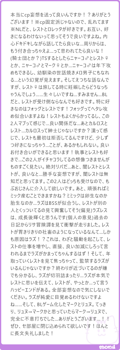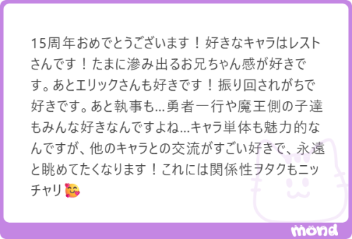 ![]() 推薦レベルの差がありすぎて草。 最初のころと比べて随分と 歩みを進めたものですね。 レストの発言は最初からずっと 変わってないけど…。 まったくブレずにクリスマスを 撲滅したがっている。 そこはちょっとくらい ブレてもいいのに。 早速、おたよりにて15周年のお祝い、 そしてお好きなキャラクターについての お声をお寄せいただきありがとうございます。 一通一通、とてもありがたく、 そして嬉しく拝読しております~! このようなお言葉に触れると、 心が明るくなって力が湧いてきますね。 ラジオでご紹介させていただく時間も、 今から楽しみにしております! 皆さんのお好きなキャラはまたいずれ 出番や活躍を増やしたいなと 私の心のToDoリストに刻んでおきます。 いつになるかはお約束できませんけれど、 こうした嬉しいことは忘れず ずっと覚えてますからね…! 10周年の折の人気投票でいただいたコメントも、 今なお心に残っております。 皆さんがふと油断なさった頃、 思いもよらぬ形で、お気に入りのキャラクターが 主役として舞台に立つこともあるかもしれません。 |