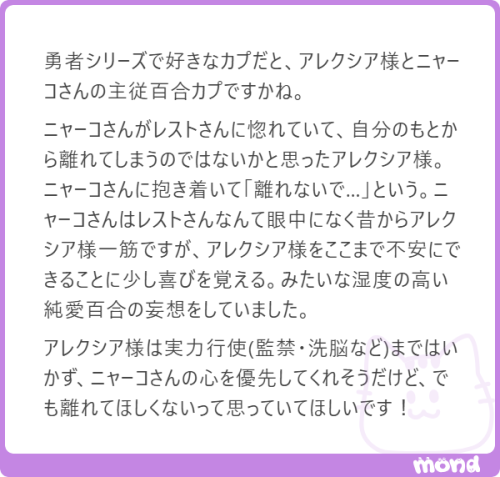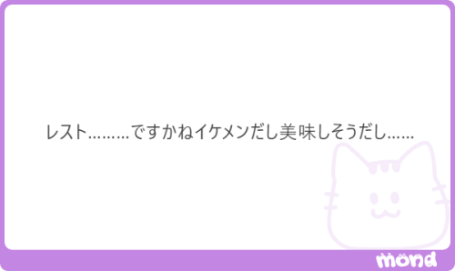 おたよりのご投稿、ならびに ラジオをご閲覧いただき、 誠にありがとうございました。 レスト達がお喋りするという形式上、ラジオ内では いろいろと拒否したりもしていましたが 私自身はすべて嬉しく拝読しております。 心から感謝申し上げます。 (拍手にお送りいただいたコメントも ありがたく拝読しております) とても熱量のあるおたよりを 送っていただきましたことですし、 皆さまもご感想などありましたらミミカツったーなどに ぜひお寄せいただけましたら幸いです。 それでは、本年も大変お世話になりました。 寒さ厳しき折、どうぞご自愛のうえ 良い年をお迎えくださいませ。 |