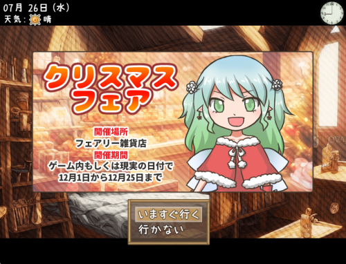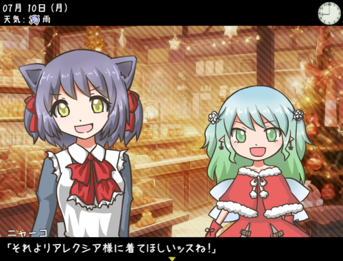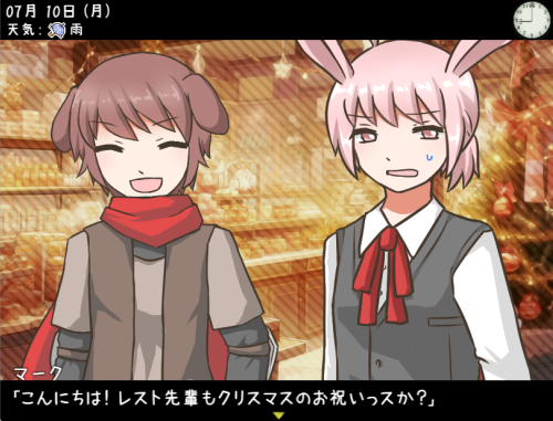 ![]() 今回のクリスマスアップデートにつきまして、 メインストーリーのテストプレイは 無事に完了しました。 現在は、サブの会話を一つ二つほど 追加できたらと考えてますが、 メインの作業はひと区切りついてますので 仮にサブ部分が間に合わなかった場合でも 今週中には更新申請を行う予定です。 区切りを設けずにいますと 作業が延びてしまいがちなので、 今回はこのあたりで一度 進めることにしました。 忙しさと疲れで体調不良も起こしがちで 休息をねじ込みつつ作業をしているため、 ものすごい亀のような歩みに なってしまってます。とほほ~。 そのせいもあって、サイト更新のほうは 控えめになっていますが、制作が落ちつけば もう少し手が回るようになる、はず…! 更新がないあいだも 地道に頑張ってはおりますので、 もうしばらくのあいだ お待ちいただけましたら幸いです。 ------------------------------- メールフォームお返事です。 12/13 遅いですが15周年おめでとうございます、 これからもよろしくお願い致します。 最後に楽しいゲームをありがとう。 お祝いの言葉をありがとうございます。 15周年はクリスマス当日で、 あと少し先のことなので まったく遅くはありませんよ。 いつもゲームをプレイしていただき 重ねて感謝申し上げます。 これからも楽しんでいただけるような ゲームをお届けできたらと思っております。 今後ともどうぞよろしくお願いいたします。 |