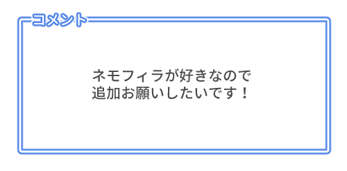 フォッグ 「花には詳しくねぇけど お前の影響でネモフィラだけは覚えた」 |