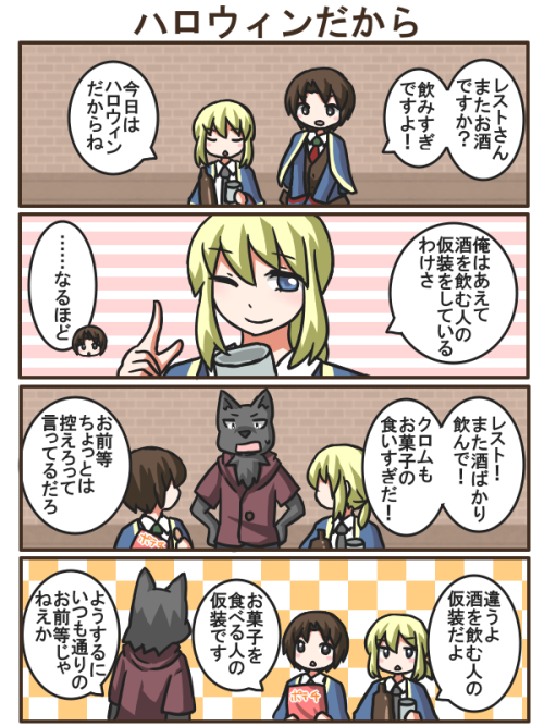 ![]() ミミカツったーで激メロな ハロウィンのレストをご投稿いただいていて めちゃめちゃメロでした。 ありがとうございます! あまりにもメロい。 大事なことなのでメロを3回言った。 作者はクソダサミミックロッドで ネタに走ってしまったけれど ちゃんと格好良いレストも見れて 皆様におかれましては、 さぞご歓喜のことと存じます。 私はもちろん大歓喜です。 ![]() ハロウィンの過去漫画も発掘したんですが もはや仮装すらしていませんでした。 そういえば昨日、トリックオアトリートって 言われたときのみんなのリアクション 考えてたんですよ。 レストとラズは「お菓子持ってないから イタズラしていいよ」と言って 面白がってきそうじゃありません? フォッグとクロムはしっかりと お菓子を用意して渡してくれそうだし、 そもそも頭の中にイタズラという 選択肢がなさそう。 「お菓子ないからイタズラで」って 言われる側になったら2人とも すごい焦りそうですね。 女性陣は問答無用で お菓子をぶんどっていくタイプが 多そうだしイタズラも問答無用で 仕掛けてきそうなので普通に怖い。 トリックアンドトリートってこと…!? |