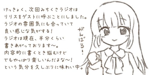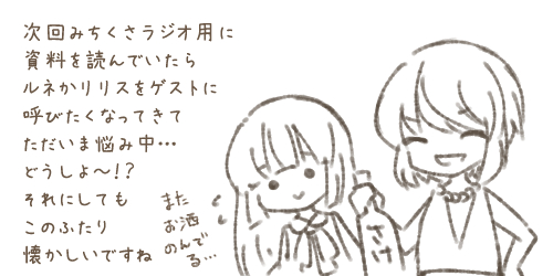 ![]() 久しぶりのみちくさラジオは お楽しみいただけましたでしょうか。 ちょっぴり…、いや、かなり ショッキングな調合レシピが 出てきましたが大丈夫でしたかね? 内容もほの暗い感じになりましたが、 こういうときリサが居てくれると 光になってくれて助かりますね。 やっぱりリサは勇者なんだ…! 今回はゲストのリリスも加えた 4人での進行でしたが、解説役が増えて バランスが良くなった気もしますね。 なかなかに良いメンバーでした。 機会があればまたリリスを 呼びたいものですね。 魔女と植物は親しい関係ですし、 ハーブとか特集することがあれば いけそうな気がします。 みちくさラジオは次回ネモフィラ、 その次はサギ草の予定となります。 忙しさが落ち着いてきたと思ったら リバイバルでウェイウェイしてきたので もう少し先になると思いますが、 とりあえず来月も1回は出来たら いいな~と祈っております。 なお、ラジオ内でも言っていたように 文献を調べて確認はしているものの知識は フワッとしたものなので、井戸端会議で ご近所さんたちが喋っているくらいの 気分でご覧いただければ幸いです。 ですので、追記情報とかオススメの 参考文献とかあれば、ぜひぜひ教えて いただけましたらありがたく存じます。 その場合も、おたより投函フォームとか みちくさラジオ用の掲示板とかゲームのコメント欄とか、 ご都合の良いところに投函いただけましたら ゲーム内におたより追加&ラジオでご紹介いたします。 もちろん、ご感想や 植物エピソードなども歓迎です。 そちらもゲーム内とラジオにて 喜んでご紹介させていただきます。 もしおたよりが多めに届いたら、 番外編みたいな感じでおたよりを 読む回を別に作ろうとは思いますが おそらく98%くらいの確率で 来ないでしょう(適当な数字) 最近はなかなかサイト更新もままならず らくがきだけポイッと投げ込むような 日々が続いておりますが、 掲示板へのご投稿や拍手コメントも 嬉しく拝読させていただいております…! ありがとうございます。 掲示板はいつの話だよって感じですね…。 昨年末…、かな…。ひぇぇ。 寝る前とかに、真っ白に燃え尽きた体で 溶鉱炉に親指を立てて沈みながら こっそり拝読しておりました。 日々の癒しをありがとう&ありがとう…。 |