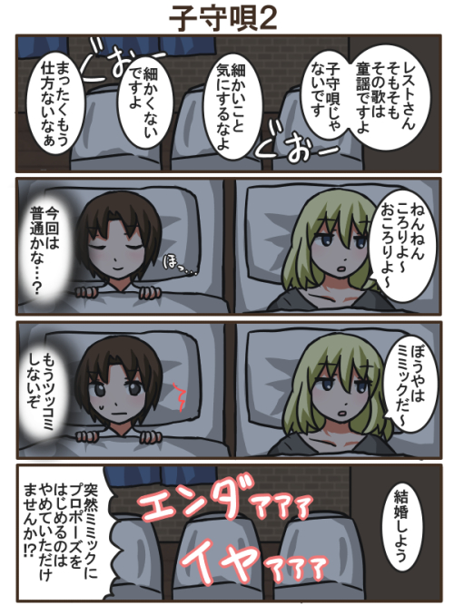 ![]() ![]() テストプレイと修正作業は 毎日ちょこちょこやっているのですが 載せられるようなスクショが 何も無かったので漫画再掲です。 そういえばもうすぐ3月9日で ミミックの日だな…、遠い昔に ミミックの日の漫画を描いた気がするな… と思って探したら行方不明だったので 代わりのミミックを発掘してきました。 ミミックといえば、 ミミカツったーにご投稿いただいた ミミック!!!良すぎませんか!? えっ、すご!!! かわい~~!!!って 声出たしテンション上がりすぎて 1人で大盛り上がりしちゃった。 みんな見て。 めちゃめちゃかわいいミミックを ありがとうございます。 小さき命がそこにある…。かわゆ…。 全世界のレストも スタンディングオベーションで 拍手喝采を送っています。 全世界のレストって何…。 増殖してる…? こわ…。 |
