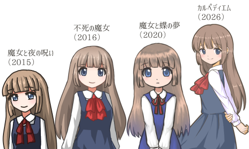 ![]() カルペディエム用の リリス立ち絵を描きました。 (表情差分はまだ) リリスの立ち絵を描くのは かなり久しぶりですね。 久しぶりに描いたとなると、 やはり過去絵と並べて 比較してみたい欲がでてきます。 というわけで歴代リリス 並べてみました、ドーン。 ![]() 魔女と蝶の夢のリリスは 過去編だからロリなので 比較対象として微妙ですが…。 少なくとも2015年よりは 良い感じになっているのでは ないでしょうか。 っていうか魔女シリーズ1作目から もうこんなに年月が経ってるの…? 10年以上…? ウッ(ショックで気絶) |